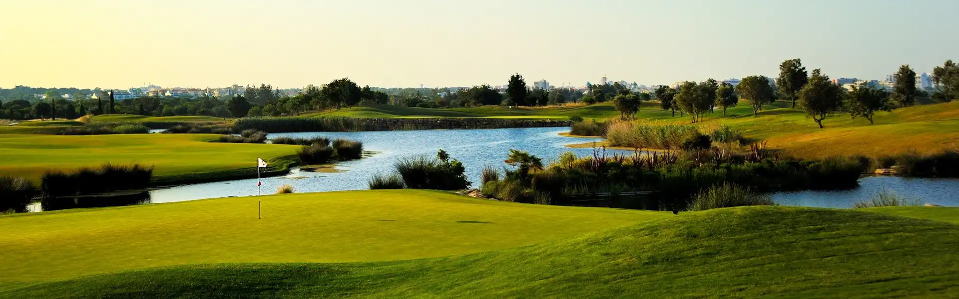 The Dom Pedro Victoria , which covers some 90 hectares, is the most recent golf course project of Arnold Palmer in Portugal. As one of the best and most sophisticated golf courses in Europe, every care has been taken to ensure the preservation of the wetlands and the typical vegetation of carob, olive and almond trees. Several lakes, occupying 13 hectares, provide mirrors of water and strategic reservoirs for irrigation.