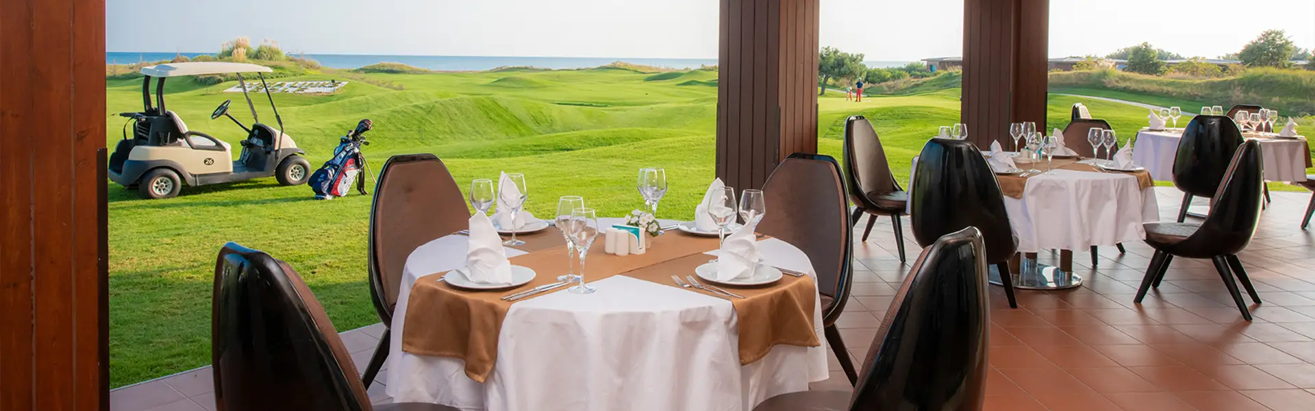 The resort offers spacious rooms and suites with views over the sea, pool, natural landscape or golf course. Room categories range from standard rooms to suites, all equipped with LCD TV, telephone, Wi-Fi, safety deposit box, minibar, hairdryer, bathroom amenities, bathrobe and slippers, ensuring a comfortable stay for golf travellers.